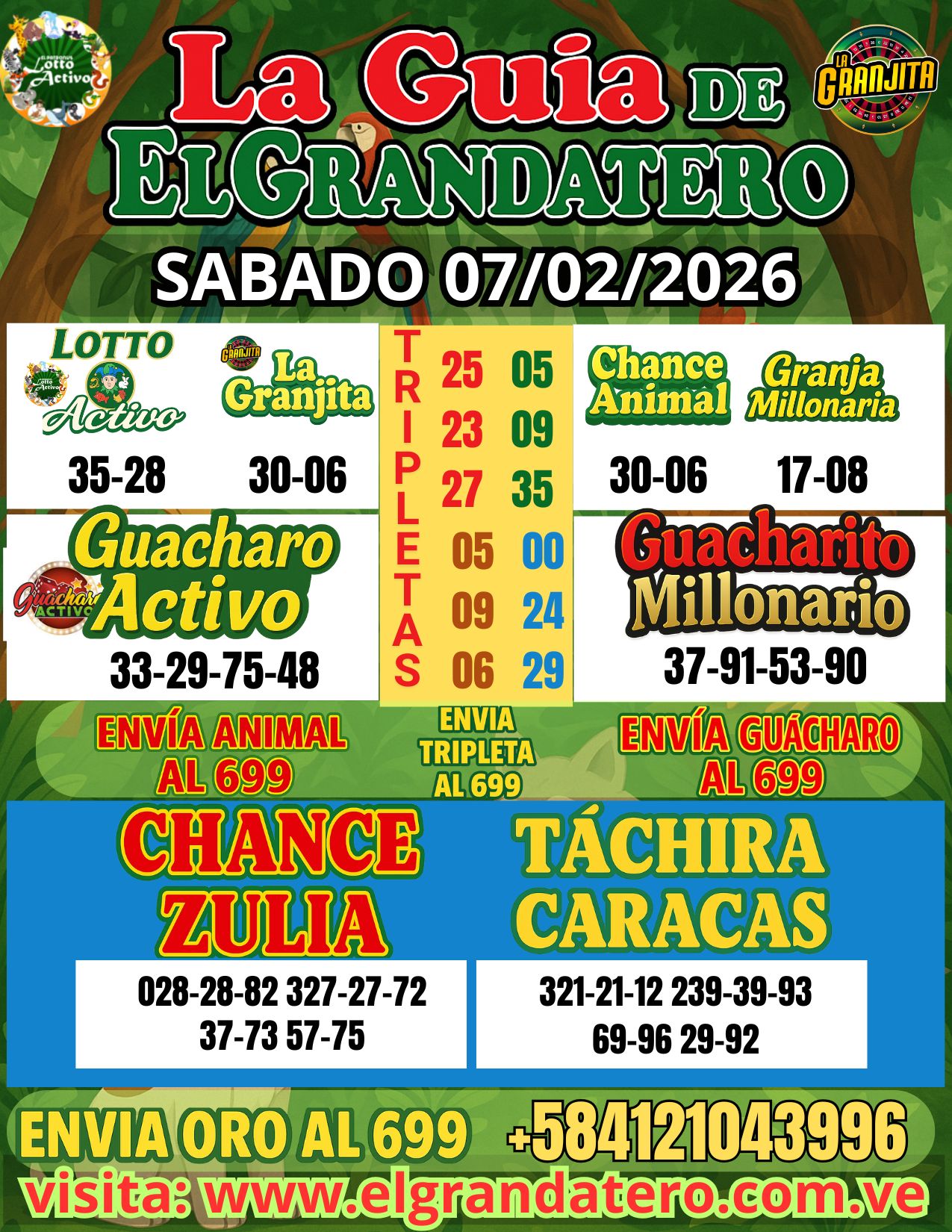 06/02 | 10:50 @elgrandatero [0412-104-3996] : Lista la informacion para VIERNES 06/02/2026 Hoy ligamos el especial MILLONARIO chance y zulia son claves para conseguir envia ORO AL 699 Y ANIMAL AL 699
